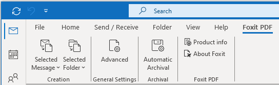 Foxit PDF Editor also adds a plugin in Microsoft Outlook when installed and appears as a tab entitled FOXIT PDF in the Outlook toolbar. The commands in the tab allow you to create a PDF file or PDF portfolio from the selected email message(s) or folder(s).