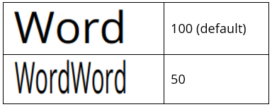 Horizontal Scaling – adjusts the width of characters by stretching or shrinking them in the horizontal direction. The scaling is specified as a percent of normal width of the characters, with 100 being the normal width. The scaling always applies to the x coordinate. The following figure shows the effect of horizontal scaling.