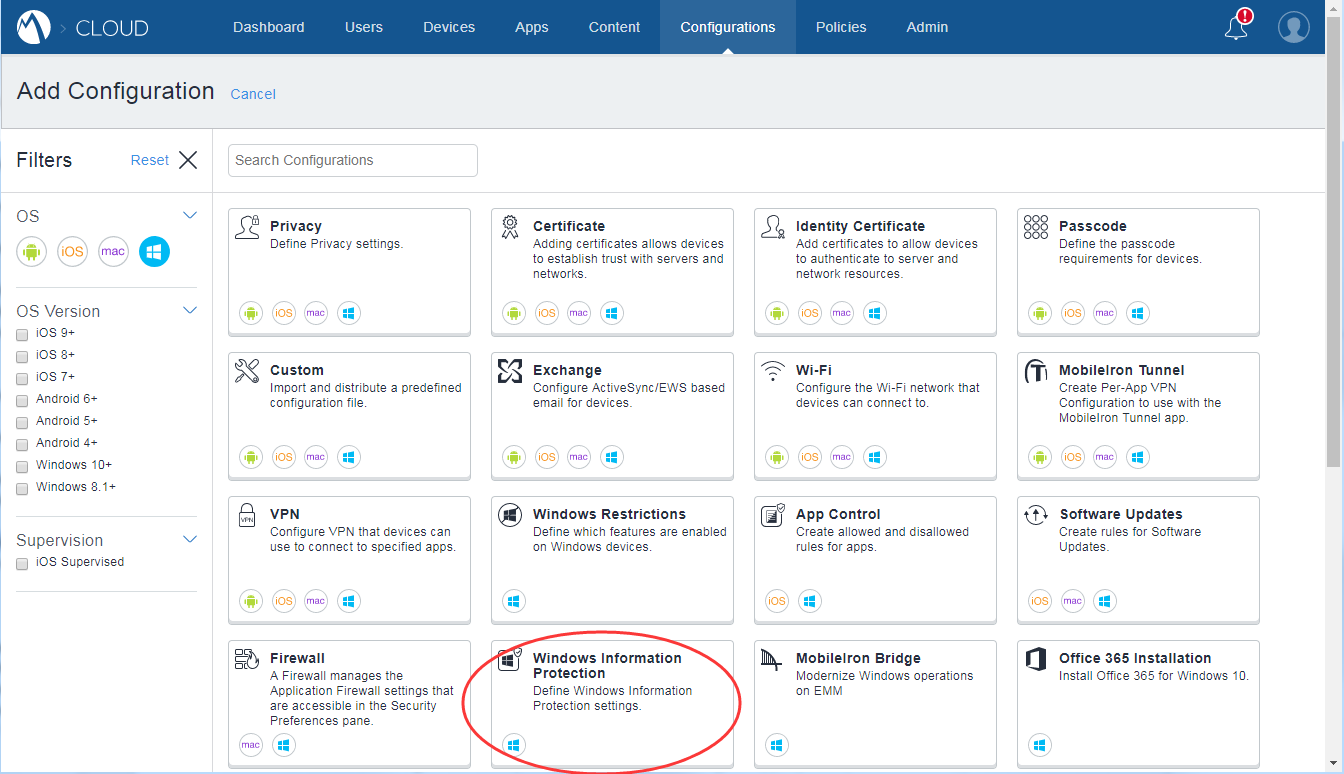 in the OS option. Then select the Windows Information Protection configuration from configuration types in the right part of the webpage.